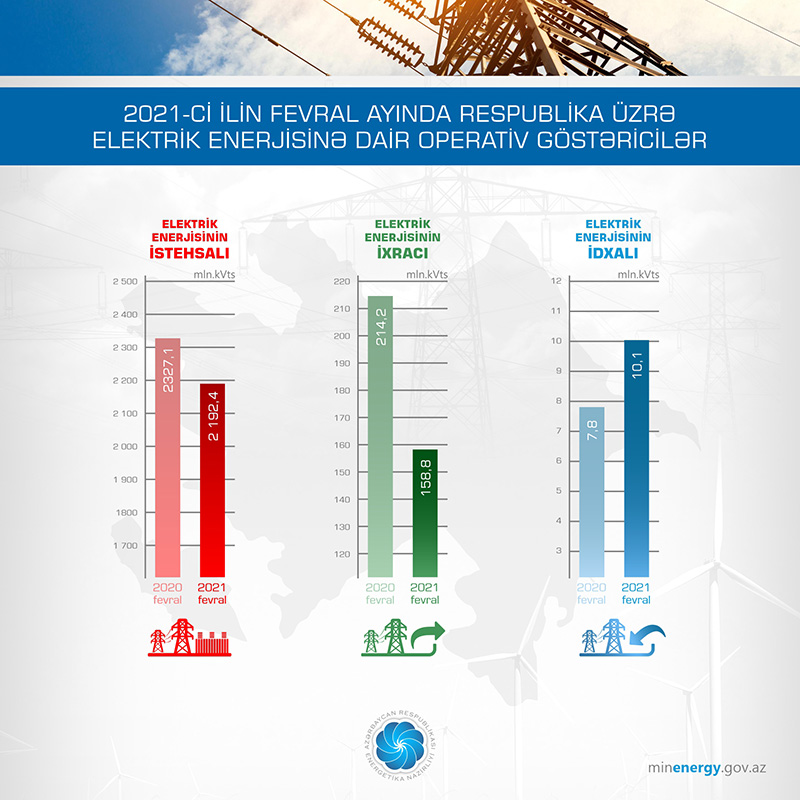 Cari ilin yanvar-fevral aylarında isə respublikada elektrik enerjisinin istehsalı 4560,8 mln. kVt·st olub. Hesabat dövründə ötən ilin 2 ayına nisbətən elektrik enerjisinin istehsalı İES-lərdə 125,7 mln. kVt·st azalaraq 4364,2 mln. kVt·st, SES-lərdə 13,8 mln. kVt·st artaraq 140,7 mln. kVt·st olub, digər mənbələr (KES, GES və BMTYZ) üzrə isə 55,9 mln. kVt·st təşkil edib. Bu dövrdə külək elektrik stansiyalarında 15,07 mln. kVt·st, günəş elektrik stansiyalarında 5,5 mln. kVt·st, bərk məişət tullantılarının yandırılması zavodunda 35,34 mln. kVt·st elektrik enerjisi istehsal edilib.