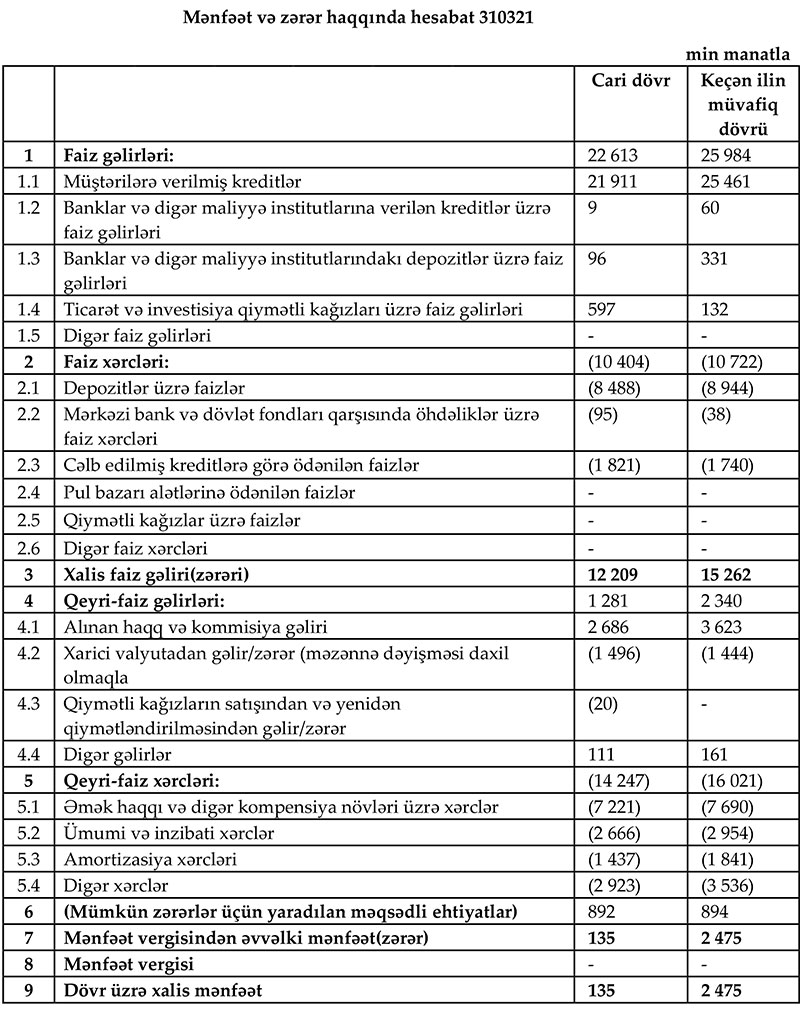 Habelə, 2021-ci ilin birinci rübü ərzində bankın xalis faiz gəlirləri 12.2 milyon manata bərabər olub.