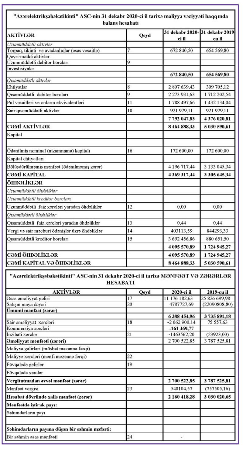"Azərelektrikşəbəkətikinti" ASC 2020-ci ili 2 milyon 160 min manat xalis mənfəət ilə başa vurub. Şirkət 2019-cu ili 3 milyon 30 min manat xalis mənfəət ilə bağlamışdı.