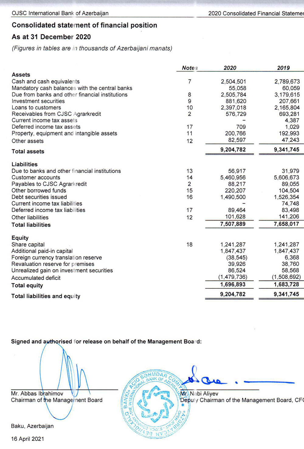 “Azərbaycan Beynəlxalq Bankı” ASC 31 dekabr 2020-ci il tarixinə olan konsolidə edilmiş maliyyə hesabatını açıqlayıb. Konsolidə edilmiş maliyyə göstəriciləri “Azərbaycan Beynəlxalq Bankı”nın maliyyə nəticələri ilə bərabər, törəmə şirkətlərinin - "ABB-Moskva" bankının, "ABB-GEO" QSC , "Azericard" MMC-nin, "Beynəlxalq Lizinq Şirkəti" MMC-nin və "ABB-İnvest İnvestisiya Şirkəti" QSC-nin maliyyə göstəricilərini də əks etdirir (birlikdə qrup). Beynəlxalq Maliyyə Hesabatı Standartlarına uyğun hazırlanmış konsolidə edilmiş maliyyə hesabatlarına müstəqil auditor şirkəti olan “Ernst & Young” (EY) şirkəti müsbət rəy verib.