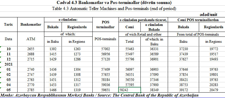 Marja Mərkəzi Bankın statistikasına istindən xəbər verir ki, 2021-ci ilin ilk 5 ayı ərzində isə POS-terminalların sayı 2 min 531 ədəd artıb. 2020-ci ilin sonunda POS-terminalların sayı 57 min 120 ədəd təşkil etmişdi.