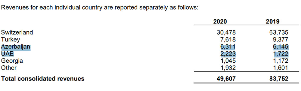 2019-cu illə müqayisədə 2020-ci ildə Azərbaycanın ən iri şirkətinin İsveçrə-də gəlirləri 2,1 dəfə azalaraq 30 milyard 478 milyon manata, Türkiyədə gəlirləri 18,7% azalaraq 7 milyard 618 milyon manata, Gürcüstanda gəlirləri isə 10,8% azalaraq 1 milyard 45 milyon manata düşüb. Şirkətin Azərbaycanda gəlirləri 2,7% artaraq 6 milyard 311 milyon manata, Birləşmiş Ərəb Əmirliklərində gəliri 29% artaraq 2 milyard 223 milyon manata, digər ölkələrdə gəliri 20,6% artaraq 1 milyard 932 milyon manata yüksəlib.