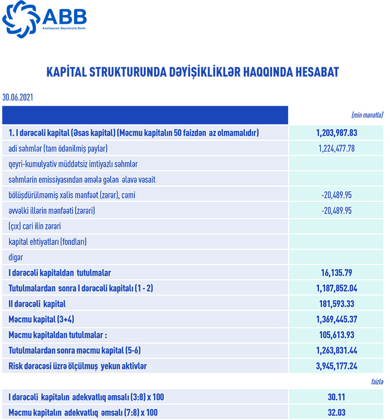 İlk yarımil ərzində ABB-nin I dərəcəli kapitalının adekvatlıq əmsalı 30.11%, məcmu kapitalının adekvatlıq əmsalı 32.03% təşkil edib. Beləliklə, Bankın kapital adekvatlığı göstəriciləri tənzimləyici orqanın müəyyən etdiyi normalardan (müvafiq olaraq 5% və 10%) əhəmiyyətli dərəcədə yüksək olub.