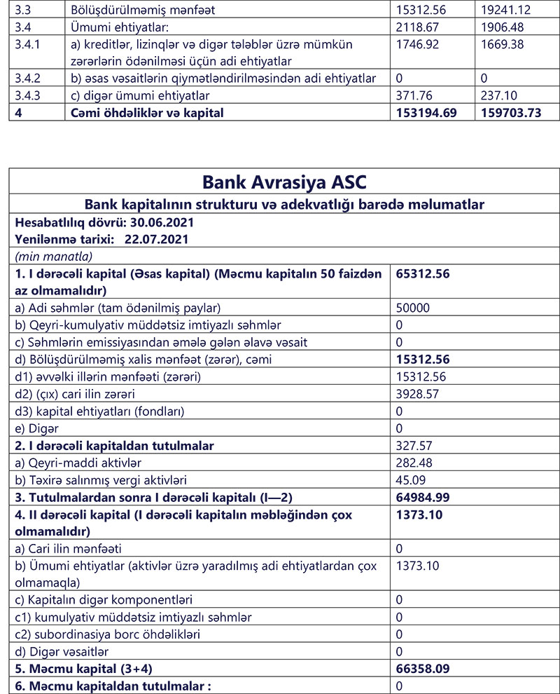 Müqayisə üçün qeyd edək ki, ötən ilin birinci yarısında "Bank Avrasiya"nın cəmi əməliyyat gəlirləri 6 milyon 181 min manat, əməliyyat xərcləri 3 milyon 355 min manat, əməliyyat mənfəəti 2 milyon 826 min manat təşkil etmişdi. Bank mümkün zərərlər üçün yaradılan məqsədli ehtiyatlara 4 milyon 404 min manat ayırdığından həmin dövrü 1 milyon 578 min manat xalis zərər ilə bağlamışdı.