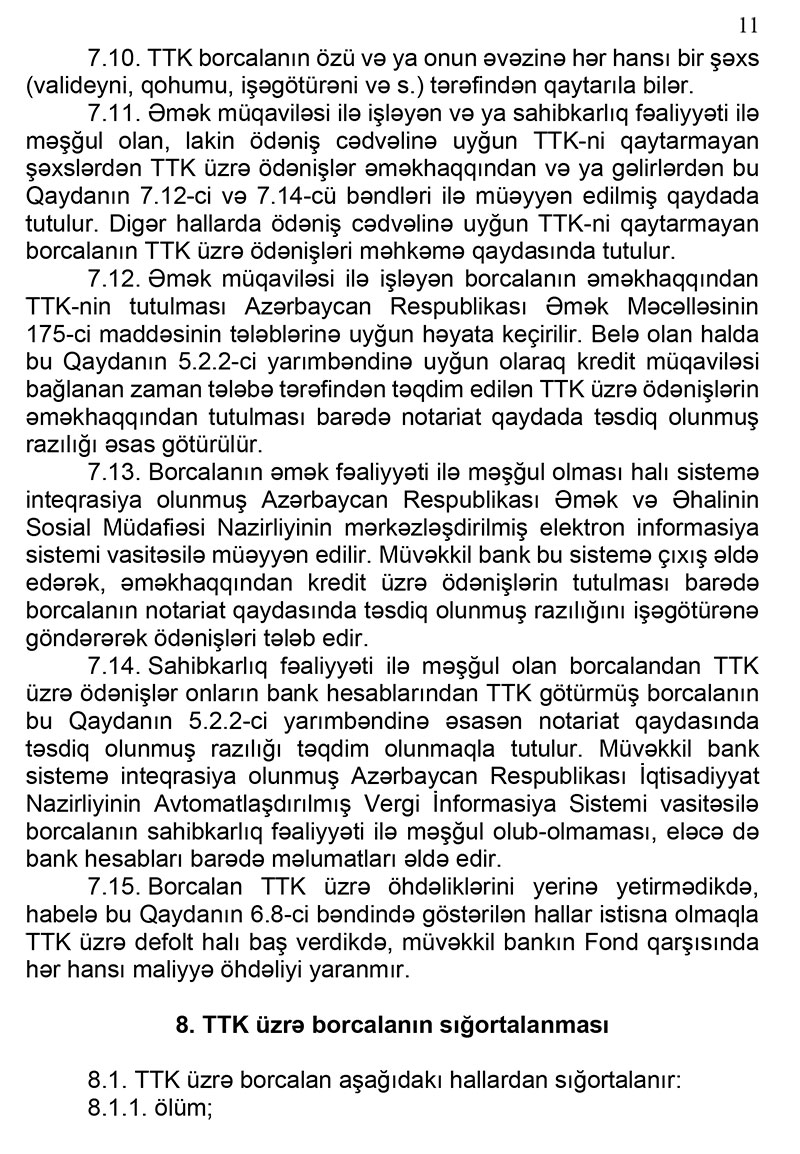 - Bu Qaydanın 5.2-ci bəndinə müvafiq olaraq notariat qaydasında təsdiq olunmuş ərizə Azərbaycan Respublikası Ədliyyə Nazirliyinin “Elektron notariat” informasiya sistemindən sorğu əsasında elektron sistemə göndərilir. Bu razılıq başqa məqsədlərə və ya digər kreditin qaytarılmasında istifadə edilə bilməz. Razılıq kredit müqaviləsinin qüvvədə olduğu müddət üçün verilir.