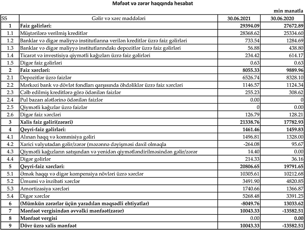 Hesabat dövrü üzrə bankın xalis faiz gəlirləri 21.3 milyon manat təşkil edib. Bu isə ötən ilin anoloji periodu ilə müqayisədə 20% artım deməkdir. Hazırda Bankın məcmu kapitalı 63.86 milyon manatdır, bu göstərici ilin əvvəlindən 10 milyon manat, requlyativ tələbdən isə 13.86 milyon manat çoxdur.