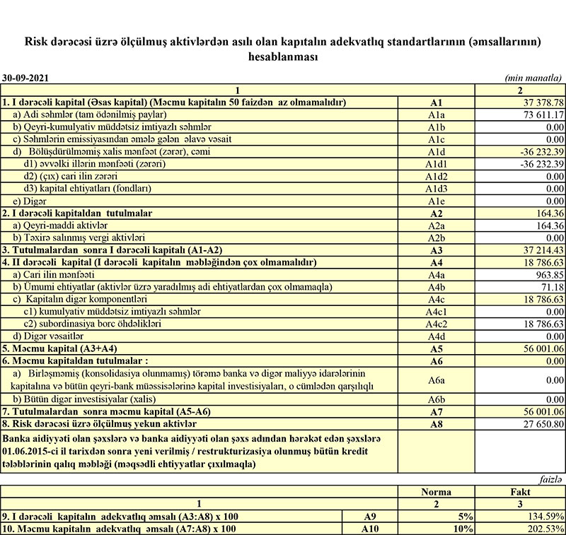 Xalis mənfəət ilə əlaqədar olaraq Bank Melli İran”ın Bakı filialının yığılmış zərəri ötən ilin sonundakı 36 milyon 232 min manatdan 35 milyon 268 min manata düşüb. "Bank Melli İran" Bakı filialına 73 milyon 611 min manat nizamanmə kapitalı yatırılsa da yığılmış 35 milyon 268 min manat zərərə görə məcmu kapitalı aşağıdır. 30 Sentyabr 2021-ci il tarixində "Bank Melli İran" Bakı filialı 56 milyon 1 min manat məcmu kapitala malik olub.