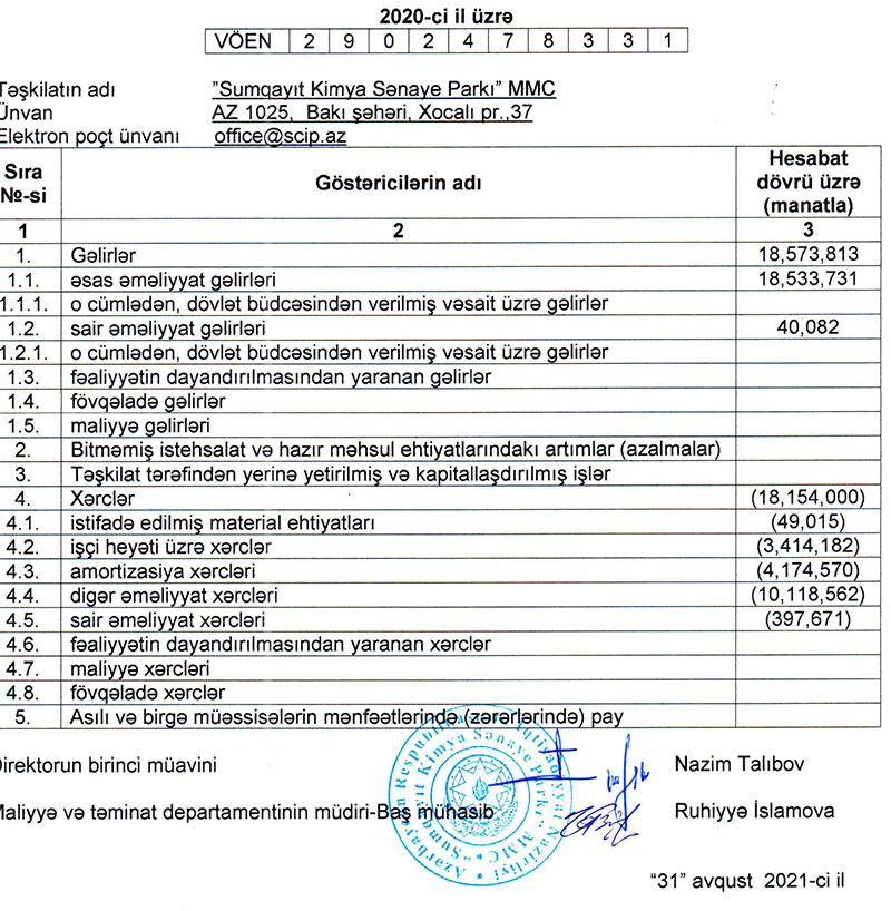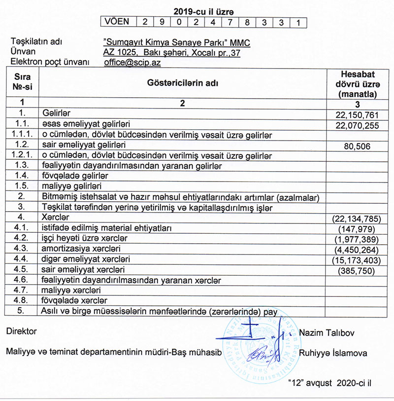 Müqayisə üçün qeyd edək ki, 2019-cu ildə "Sumqayıt Kimya Sənaye Parkı" MMC-nin cəmi gəlirləri 22 milyon 151 min manat, cəmi xərcləri 22 milyon 134 min manat, mənfəəti isə 17 min manat təşkil etmişdi. Beləliklə, 2019-cu illə müqayisədə 2020-ci ildə dövlət şirkətinin gəlirləri 16,2% xərcləri isə 17,9% azalıb.