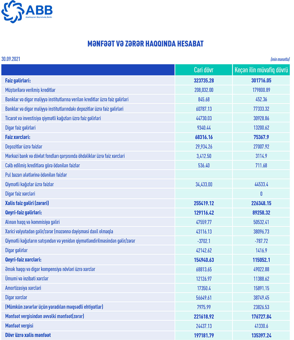 Beləliklə, 2021-ci ilin 9 ayında Bankın cəmi əməliyyat gəlirləri 452 milyon 851 milyon manat, cəmi əməliyyat xərcləri 223 milyon 256 min manat, gəlirlər xərcləri üstələdiyindən əməliyyat mənfəəti 229 milyon 595 min manat təşkil edib. Bank əməliyyat mənfəətindən 7 milyon 976 min manat mümkün zərərlər üçün yaradılan ehtiyata ayırıb, 24 milyon 437 min manat mənfəət vergisi ödəyib və nəticədə 9 ayı 197 milyon 182 min manat xalis mənfəətlə bağlayıb.