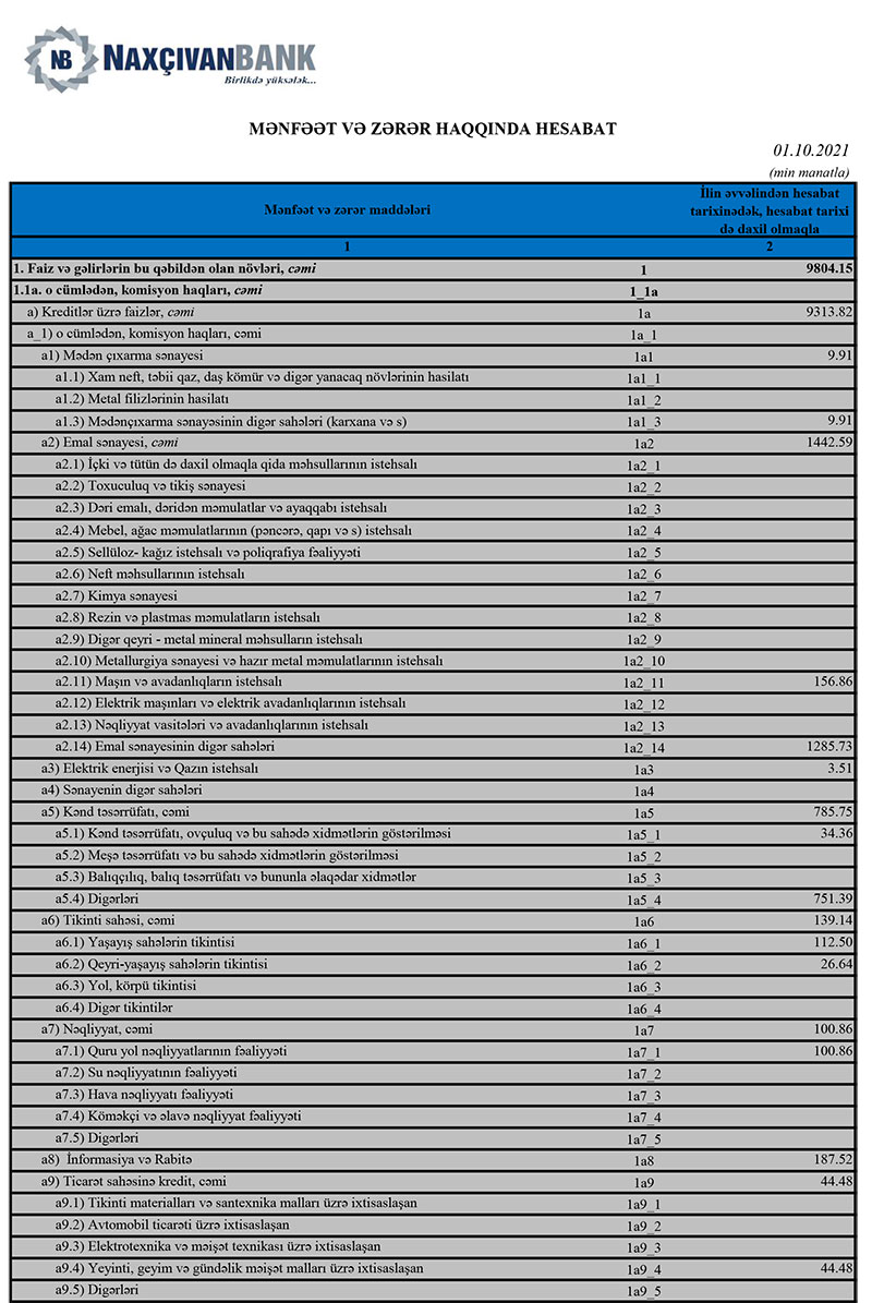 “Naxçıvanbank” ASC-nin xalis mənfəəti 2021-ci ilin 9 ayında (yanvar-sentyabr) 5 milyon 924 min manat təşkil edib ki, bu da ötən ilin eyni dövrü ilə müqayisədə 804 min manat və ya 11,9% azdır. Bank 2020-ci ilin 9 ayını 6 milyon 728 min manat xalis mənfəət ilə bağlamışdı. Xalis mənfəətin azalmasına Bankın bu il mənfəət vergisi ödəməsi səbəb olub.