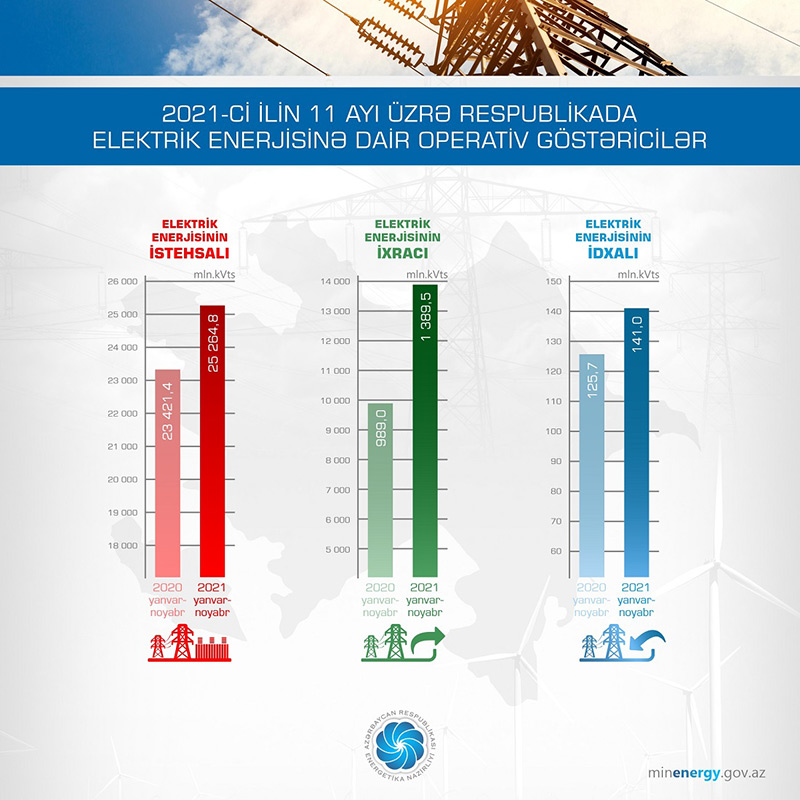 Energetika Nazirliyinin yaydığı məlumata görə, 2021-ci ilin 11 ayı üzrə elektrik enerjisinə dair operativ məlumatlara əsasən, noyabr ayında respublika üzrə elektrik enerjisinin istehsalı 2408,9 mln. kVt·st, ixracı 233,9 mln. kVt·st, idxalı 10,4 mln. kVt·st olub. Ötən ilin müvafiq dövrü ilə müqayisədə noyabr ayında respublika üzrə elektrik enerjisinin istehsalı 288,4 mln. kVt·st, ixrac 146,1 mln. kVt·st artıb, idxal isə 0,3 mln. kVt·st azalıb.