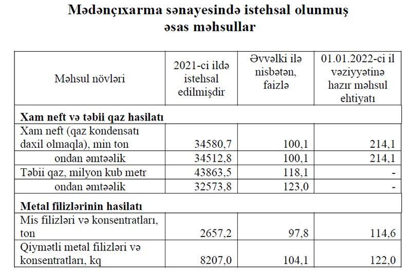 2021-ci ildə Azərbaycanın mədənçıxarma sənayesində istehsalın ümumi dəyəri 35,1 milyard manat olmaqla, əvvəlki ilə nisbətən 1,9 faiz artmışdır.