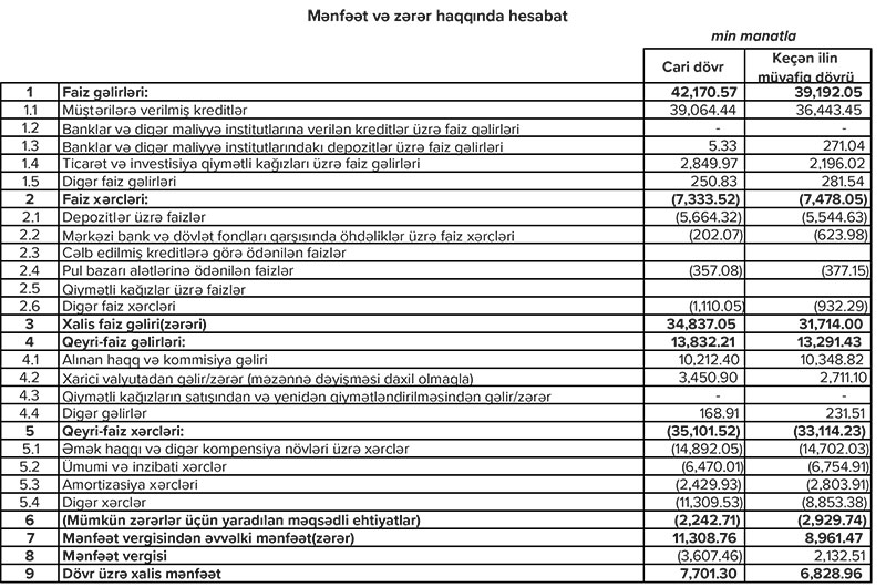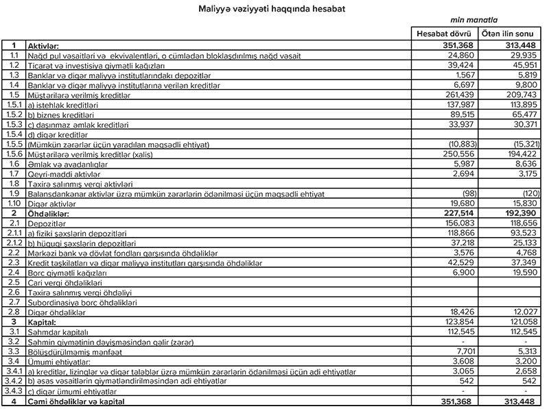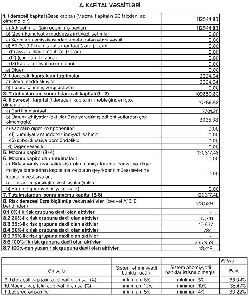 Qeyd edilb ki, maliyyə nəticələrinə əsasən, 2021-ci il ərzində bankın aktivlərinin həcmində 12.1% artım qeydə alınıb. Bununla da hesabat dövrünə bankın cəmi aktivləri 351.37 milyon manat təşkil edib. Ötən ilin nəticələrinə görə, Bankın məcmu kapitalının həcmində 2.8% artım olub. Belə ki, hesabat dövrünün sonuna Bankın məcmu kapitalı 120.62 milyon manata çatıb.