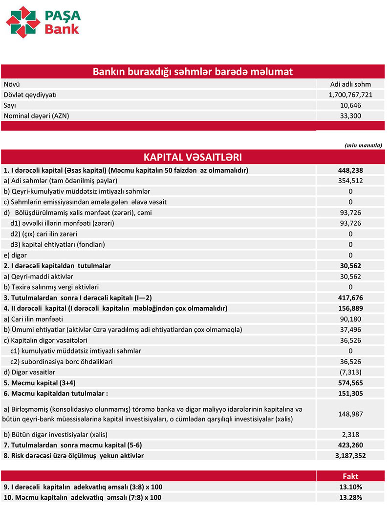 31 Dekabr 2021-ci il tarixində “PAŞA Bank” 423 milyon 260 min manat məcmu kapitala malik olub.