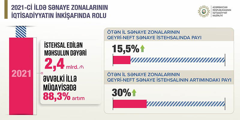 Sənaye zonaları iqtisadiyyatın diversifikasiyasında, xüsusilə qeyri-neft sənayesinin inkişafında mühüm rol oynayır. 2021-ci il ərzində sənaye zonalarında 2,4 milyard manat dəyərində məhsul istehsal edilib ki, bu da əvvəlki illə müqayisədə 88,3% çoxdur.