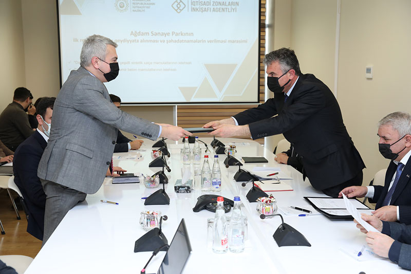 İqtisadiyyat Nazirliyinin İqtisadi Zonaların İnkişafı Agentliyində bununla bağlı keçirilən tədbirdə sahibkarlara Sənaye Parkının rezidentinin qeydiyyat şəhadətnaməsi təqdim olunub.