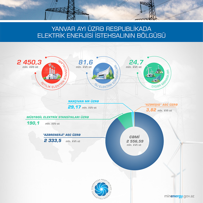 Hesabat dövründə ötən ilin yanvar ayına nisbətən elektrik enerjisinin istehsalı İES-lərdə 190,3 mln. kVt·st artaraq 2450,3 mln. kVt·st, SES-lərdə 3,4 mln. kVt·st artaraq 81,6 mln. kVt·st, digər mənbələr (KES, GES və BMTYZ) üzrə isə 5,5 mln. kVt·st azalaraq 24,7 mln. kVt·st olub. Külək elektrik stansiyalarında 6,7 mln. kVt·st, günəş elektrik stansiyalarında 3,3 mln. kVt·st, Bərk Məişət Tullantılarının Yandırılması Zavodunda (BMTYZ) isə 14,7 mln. kVt·st elektrik enerjisi istehsal edilib.