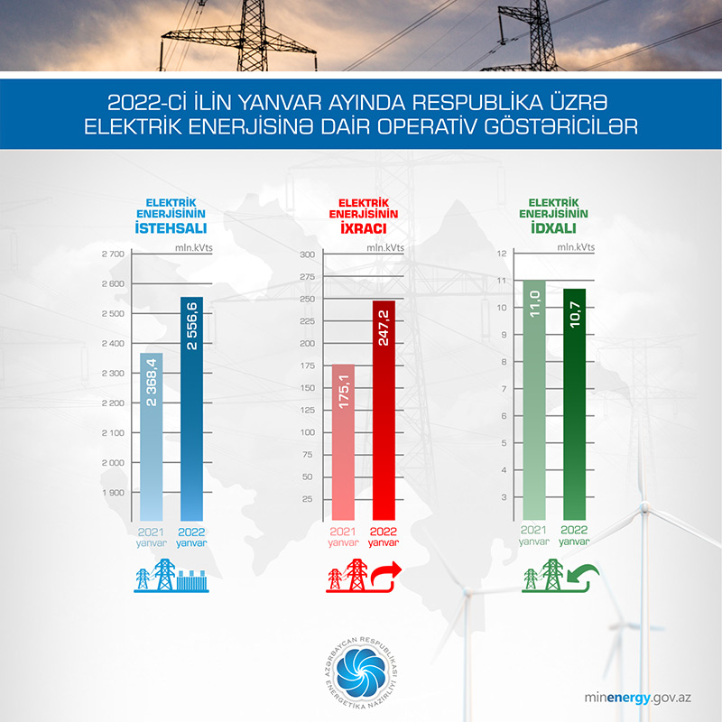 Yanvar ayında elektrik enerjisinin ixracı 247,2 mln. kVt·st olmaqla, 2021-ci ilin müvafiq dövrü ilə müqayisədə 72,1 mln. kVt·st artıb. Elektrik enerjisinin idxalı isə 10,7 mln. kVt·st olmaqla, 2021-ci ilin müvafiq dövrünə nisbətən 0,3 mln. kVt·st azalıb.