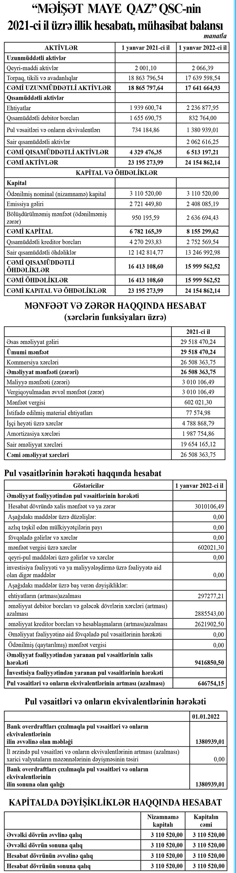 Azərbaycan ərazisində maye qazın nəql edilməsi və bölüşdürülməsi, qaz balonlarının təmiri və sınağı üzrə xidmətləri üzrə aparıcı şirkət olan “Məişət Maye Qaz” QSC 2021-ci ili 2 milyon 408 min manat xalis mənfəət ilə başa vurub. Şirkət 2020-ci ili 2 milyon 721 min manat xalis mənfəət ilə bağlamışdı.