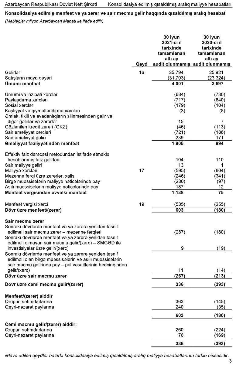 Marja.az hesabatlara istinadən xəbər verir ki, Azərbaycanın ən böyük şirkəti ötən ilin ilk 6 ayını 603 milyon manat xalis mənfəət ilə başa vurub. Halbuki, Şirkət 2020-ci ilin 1-ci yarısını 180 milyon manat xalis zərər ilə bağlamışdı.