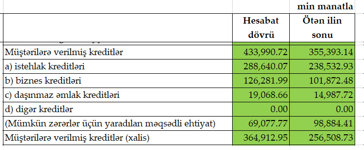 2021-ci ilin sonu ilə müqayisədə 2022-ci ilin ilk rübündə “Bank of Baku” tərəfindən müştərilərə verilmiş cəmi kreditlər 78 milyon 597 min manat və ya 22,1% artaraq 433 milyon 991 min manata yüksəlib (31 Mart 2022-ci il tarixinə olan məlumat).