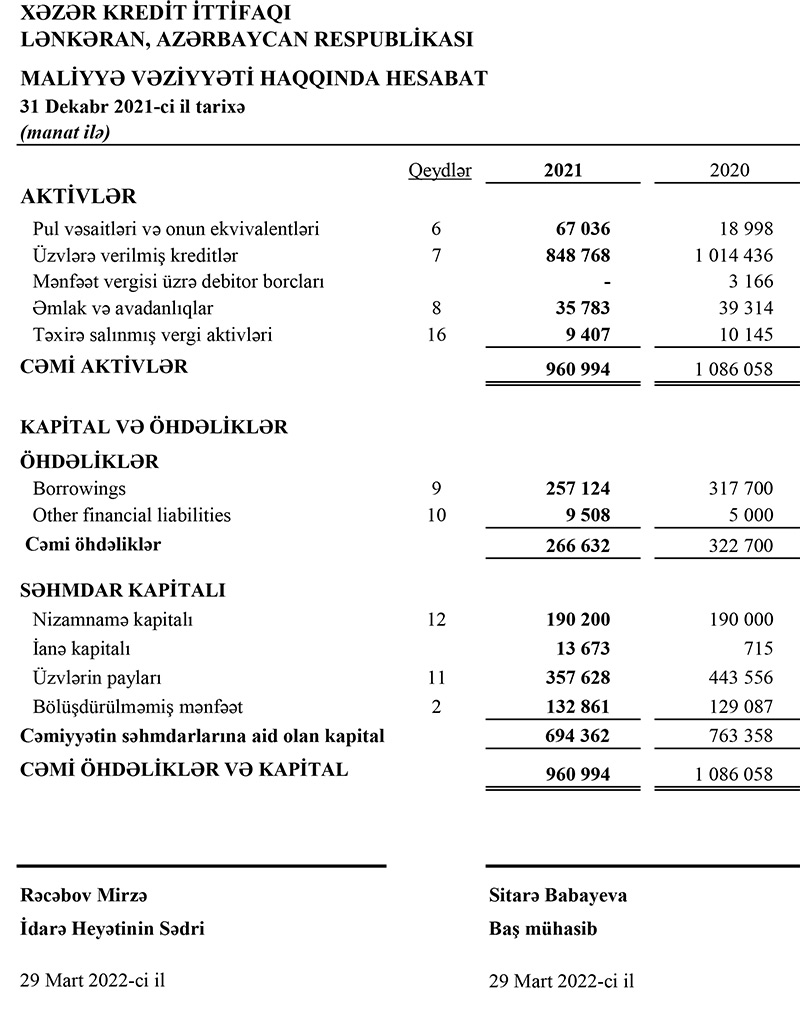 Ötən il üzvlərə verilmiş kreditlər 16,3% azalaraq 848 min 768 manata geriləyib. 2020-ci ilin sonunda İttifaqın üzvlərə verdiyi kreditlər 1 milyon 14 min 436 manata çatmışdı.