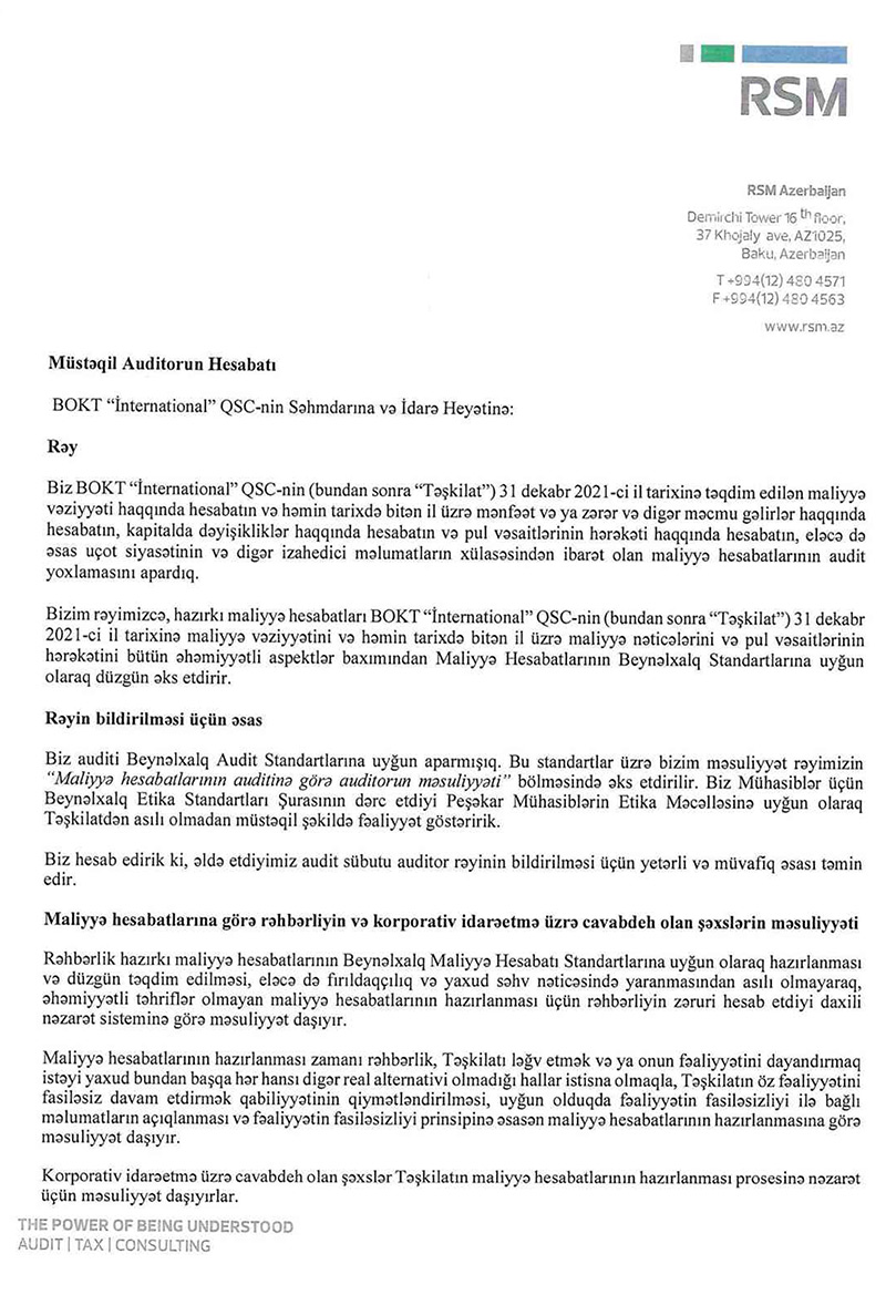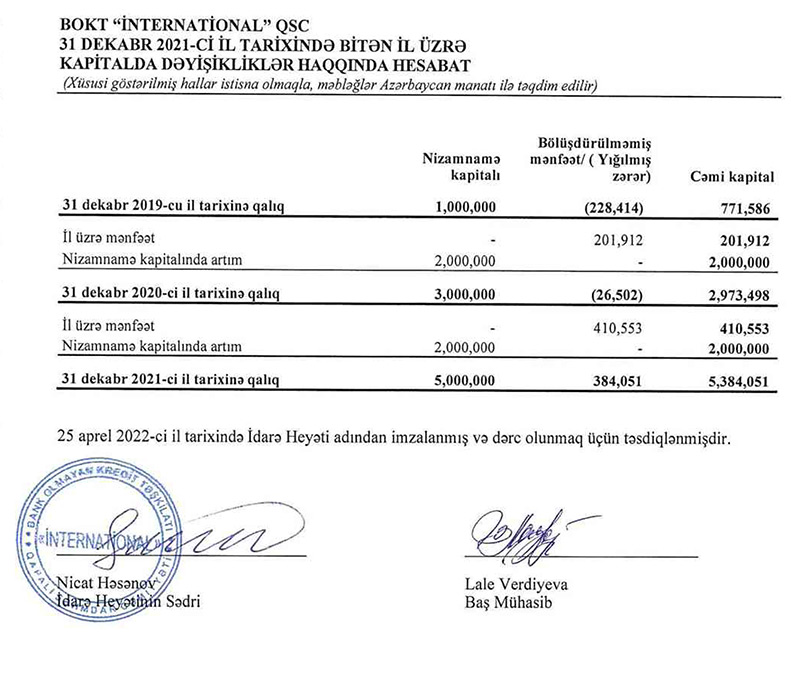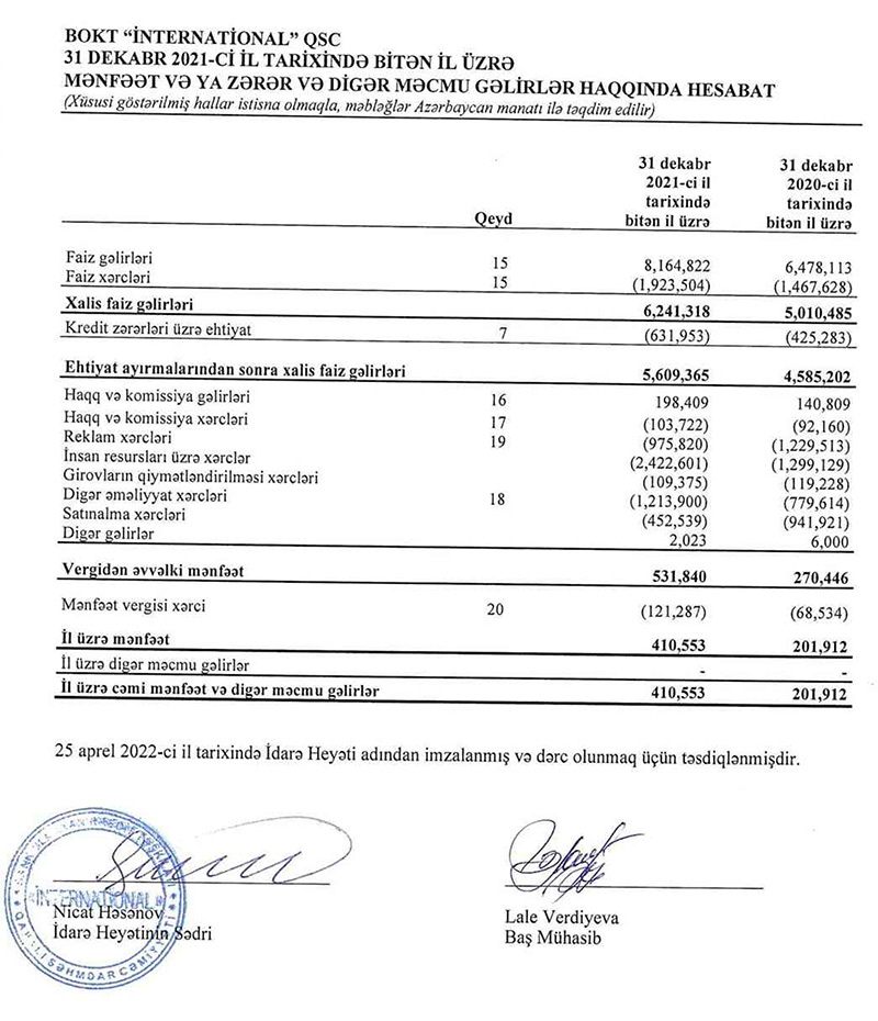 BOKT "İnternational" QSC 2021-ci ili 410 min 553 manat xalis mənfəət ilə başa vurub. Halbuki, təşkilat 2020-ci ili 201 min 902 manat xalis mənfəət ilə bağlamışdı. Beləliklə, 2020-ci illə müqayisədə 2021-ci ildə BOKT "İnternational"ın xalis mənfəəti 2 dəfədən çox artıb.