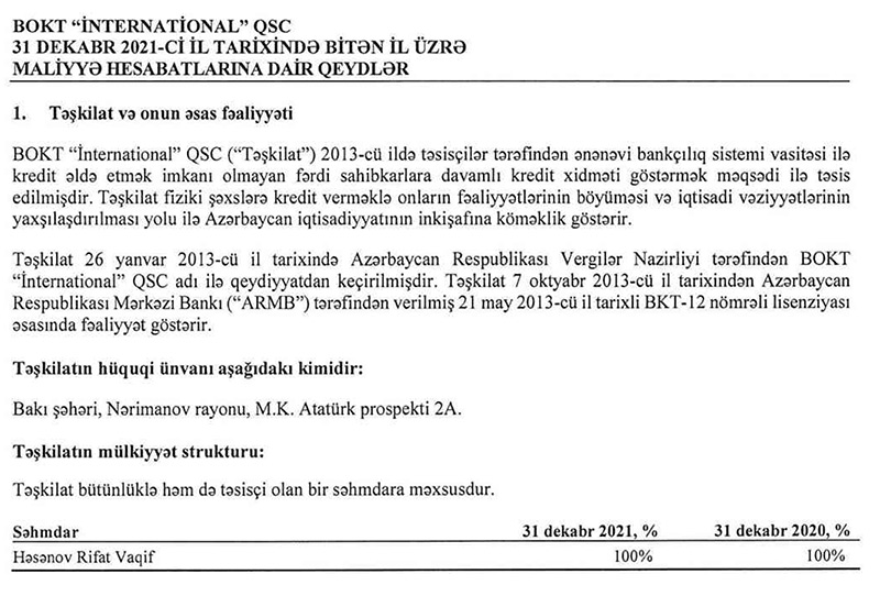 BOKT "İnternational" QSC 100% payla səhmdarı Həsənov Rifat Vaqif oğludur.