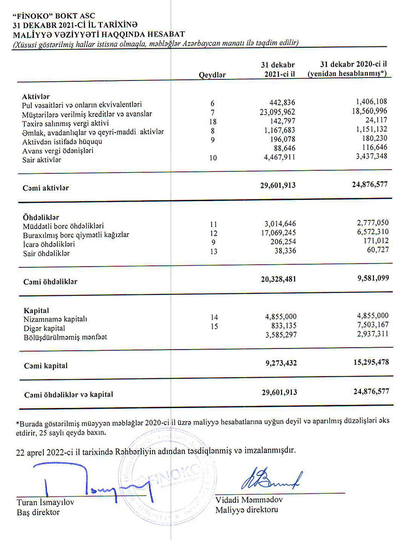 "Finoko" BOKT ASC 2021-ci ili 1 milyon 142 min manat xalis mənfəət ilə başa vurub. Halbuki, Təşkilat 2020-ci ili 2 milyon 486 min manat xalis mənfəət ilə bağlamışdı. Beləliklə, 2020-ci illə müqayisədə 2021-ci ildə "Finoko"nun xalis mənfəəti 2,2 dəfə azalıb.