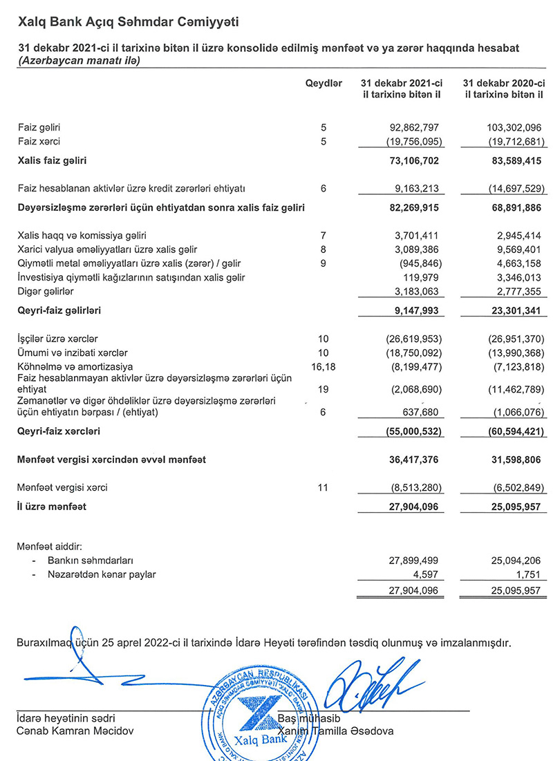 Marja.az hesabatlara istinadən xəbər verir ki, "Xalq Bank" 2021-ci ili 27 milyon 904 min manat xalis mənfəət ilə başa vurub. Halbuki, Bank 2020-ci ili 25 milyon 96 min manat xalis mənfəət ilə bağlamışdı.