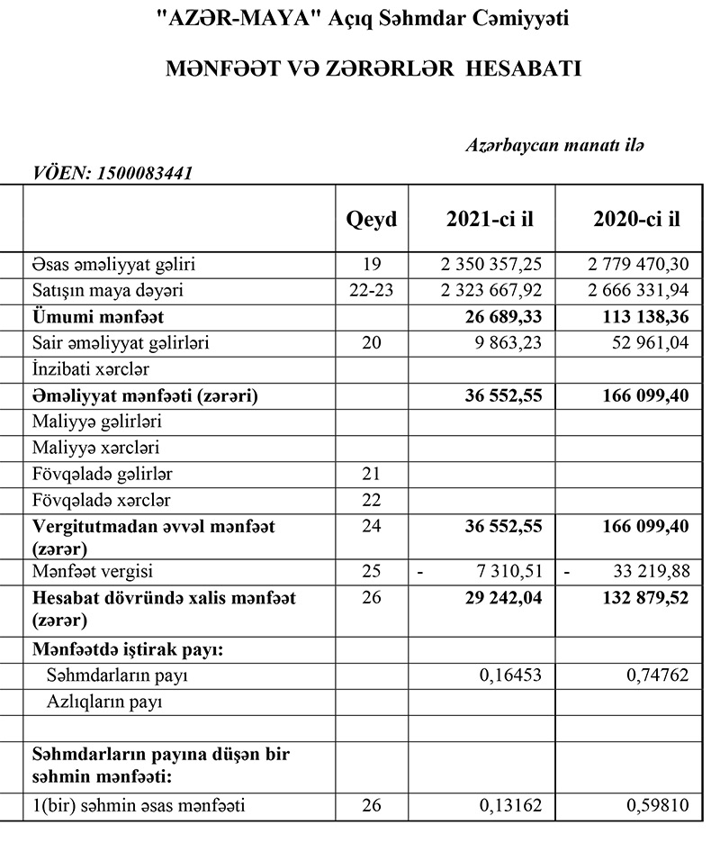 Marja.az xəbər verir ki, “Azər Maya”nın satışdan gəliri 2020-ci ildə 2 milyon 779 min 470 manat ikən, 2021-ci ildə 2 milyon 350 min 357 manata düşüb (15,4% azalıb). Satışın maya dəyəri isə 2 milyaon 666 min 331 manatdan 2 milyon 323 min 667 manata geriləyib (12,8% azalıb)