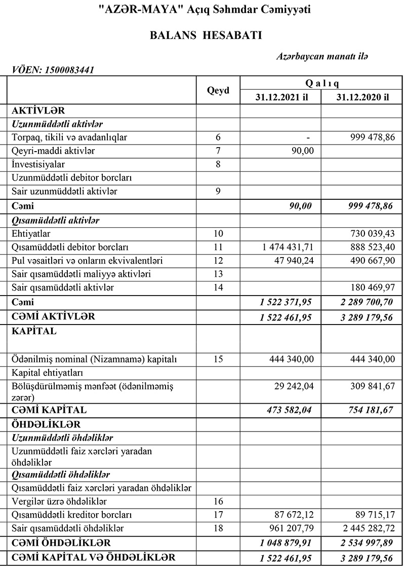 31 Dekabr 2021-ci il tarixində “Azər Maya” ASC 1 milyon 522 min 461 manat cəmi aktivlərə malik olub. ASC 2020-ci ilin sonunda 3 milyon 289 min 179 manat cəmi aktivlərə malik idi (aktivləri 2,2 dəfə azalıb).