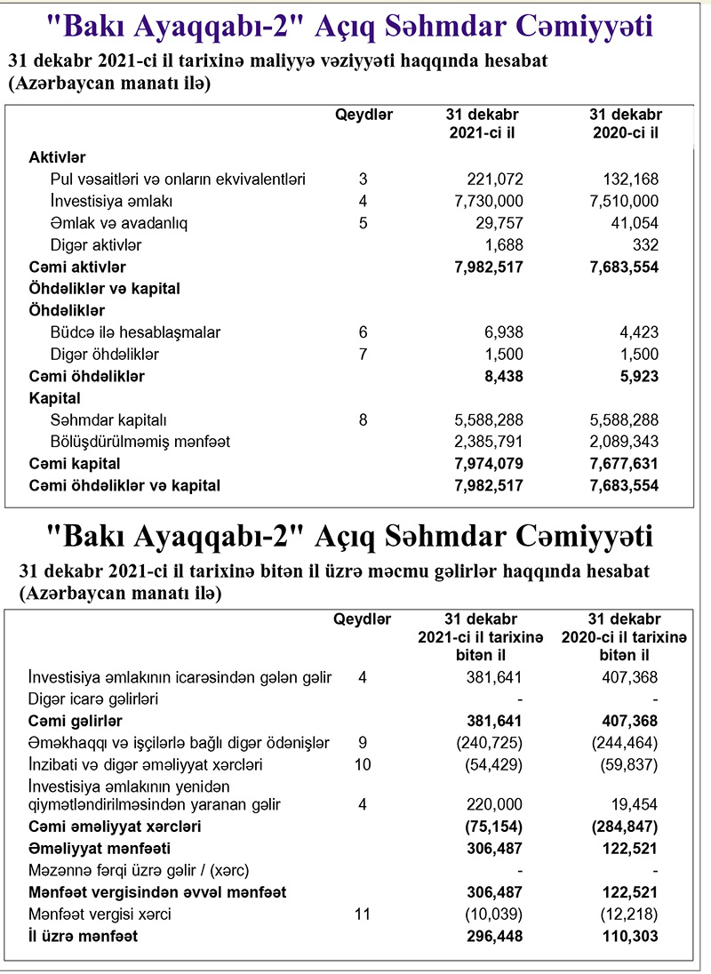 "Bakı Ayaqqabı-2" ASC 2021-ci ili 296 min 448 manat xalis mənfəət ilə başa vurub. Halbuki, şirkət 2020-ci ili 110 min 303 manat xalis mənfəət ilə bağlamışdı. Beləliklə, 2020-ci illə müqayisədə 2021-ci ildə "Bakı Ayaqqabı -2"nin xalis mənfəəti 2,7 dəfə artıb.