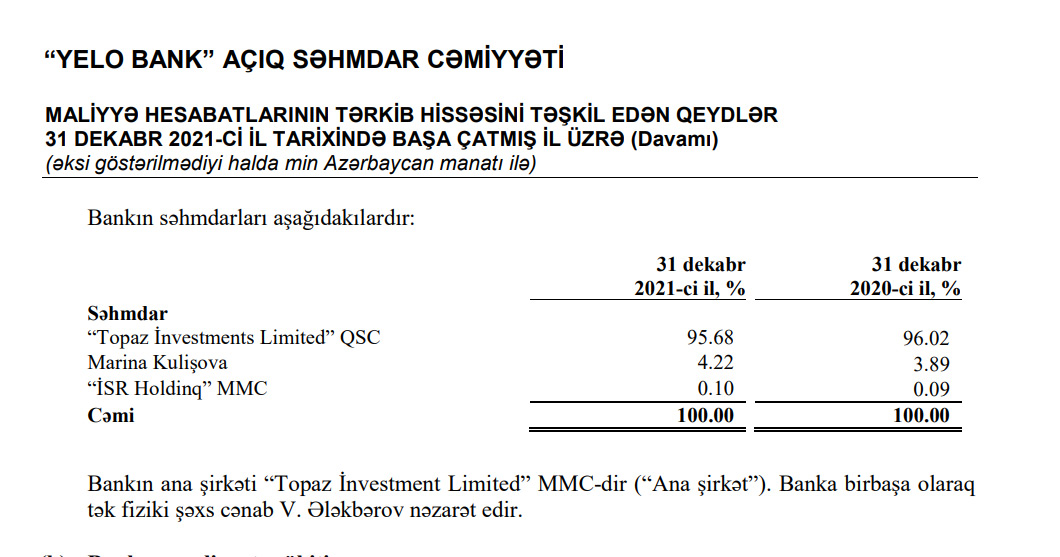 Marja.az xəbər verir ki, Bankın əsas səhmdarı “Topaz İnvestments Limited” QSC-nin payı 96.02%-dən 95.68%-ə düşüb, “İSR Holdinq” MMC-nin payı 0.09%-dən 0.10%-ə, Marina Kulişovanın payı isə 3.89%-dən 4.22%-ə yüksəlib. Marina Kulişova "Yelo Bank" ASC-nin Müşahidə şurasının sədridir.