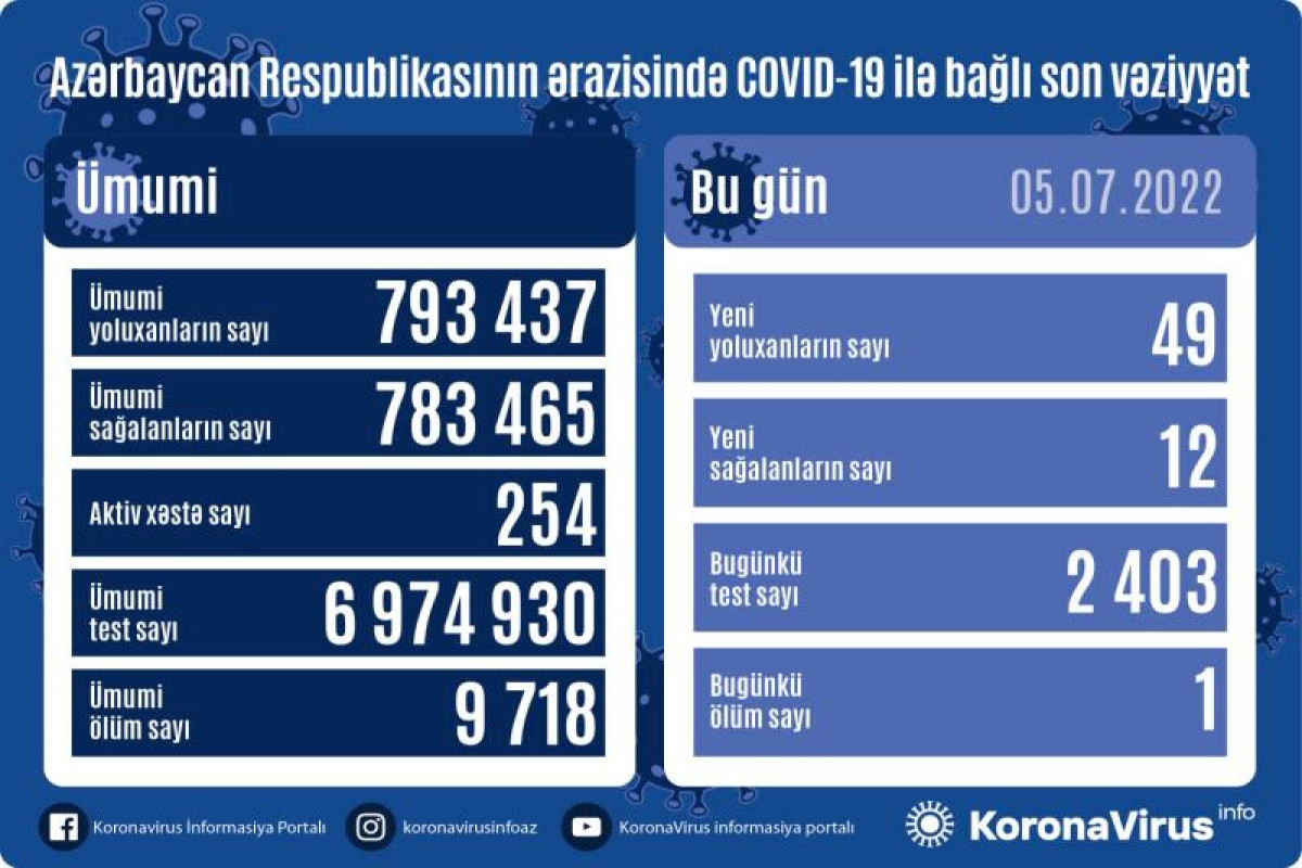 Azərbaycan Respublikasında koronavirus (COVID-19) infeksiyasına 49 yeni yoluxma faktı qeydə alınıb, 12 nəfər müalicə olunaraq sağalıb.