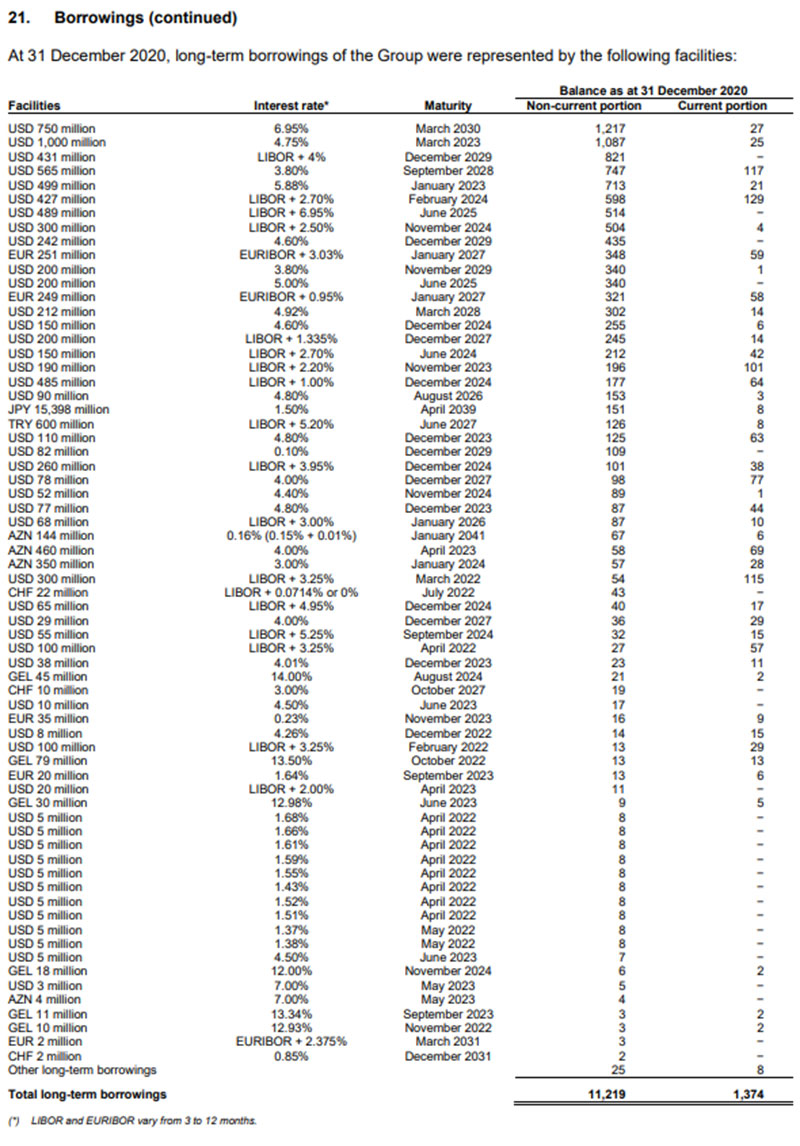 SOCAR-ın 21 milyard 366 milyon manat borclarının 15 milyard 501 milyon manatını uzunmüddətli, 5 milyard 865 milyon manatını qısamüddətli borclar təşkil edib. Qısamüddətli borclar 2022-ci ilin sonunadək ödənilməlidir. Uzunmüddətli borcların son ödəniş tarixləri 2023-2030-cu illərdədir.