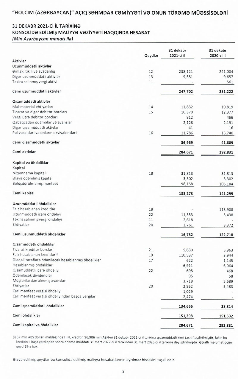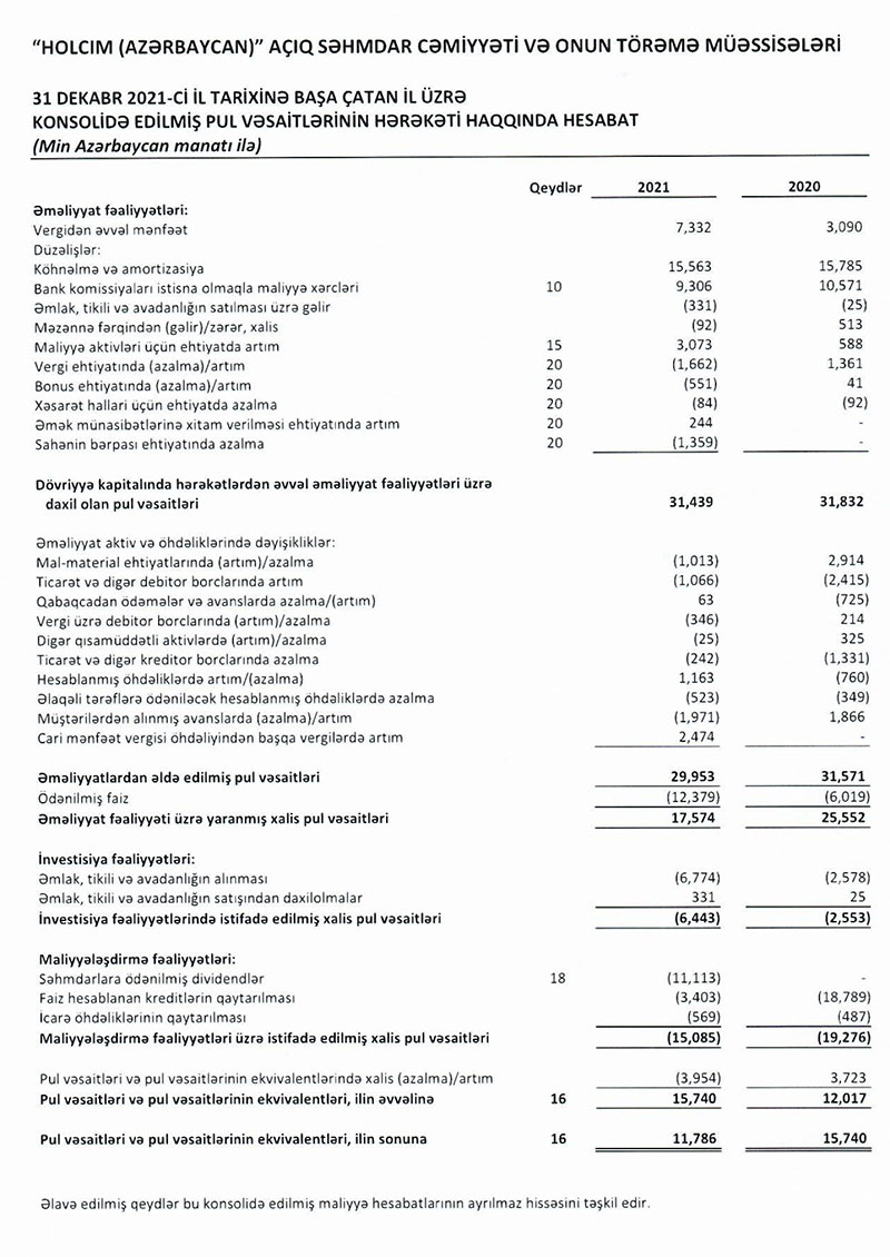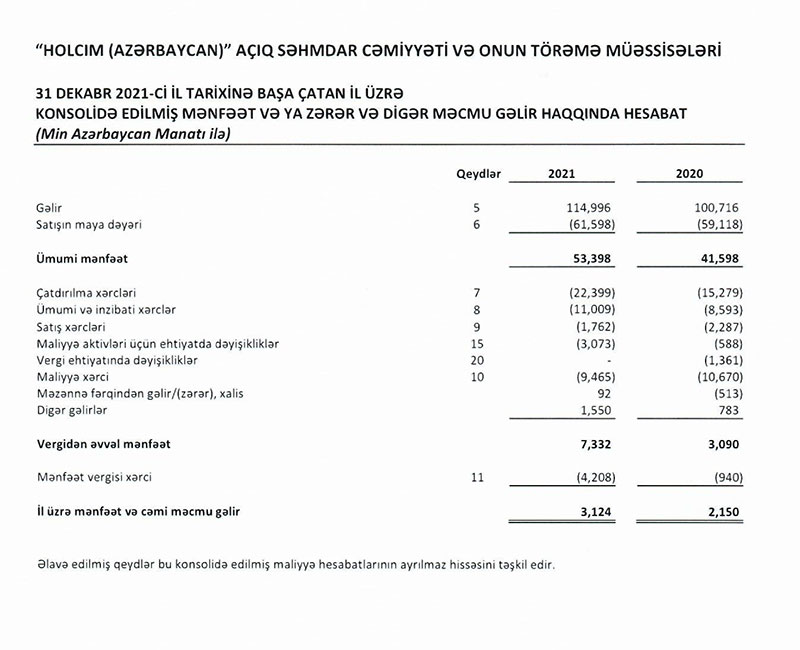 İri sement istehsalçısı "Holcim (Azərbaycan)" ASC 2021-ci ili 3 milyon 124 min manat xalis mənfəət ilə başa vurub. Şirkət 2020-ci ili 2 milyon 150 min manat xalis mənfəət ilə bağlamışdı. Beləliklə, 2020-ci illə müqayisədə 2021-ci ildə "Holcim (Azərbaycan)" ASC-nin xalis mənfəəti 974 min manat və ya 45,3% artıb.