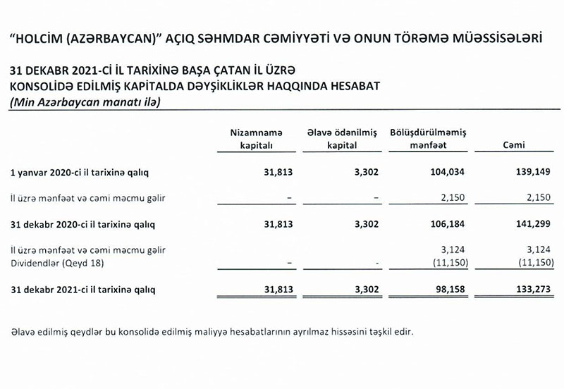 31 Dekabr 2021-ci il tarixində "Holcim (Azərbaycan)" ASC-nin bölüşdürülməmiş mənfəəti 98 milyon 158 min manat təşkil edib ki, bu da 2020-ci ilin sonu ilə müqayisədə 8 milyon 26 min manat azdır. Şirkət 2020-ci ilin sonunda 106 milyon 184 min manat bölüşdürülməmiş mənfəətə malik idi.