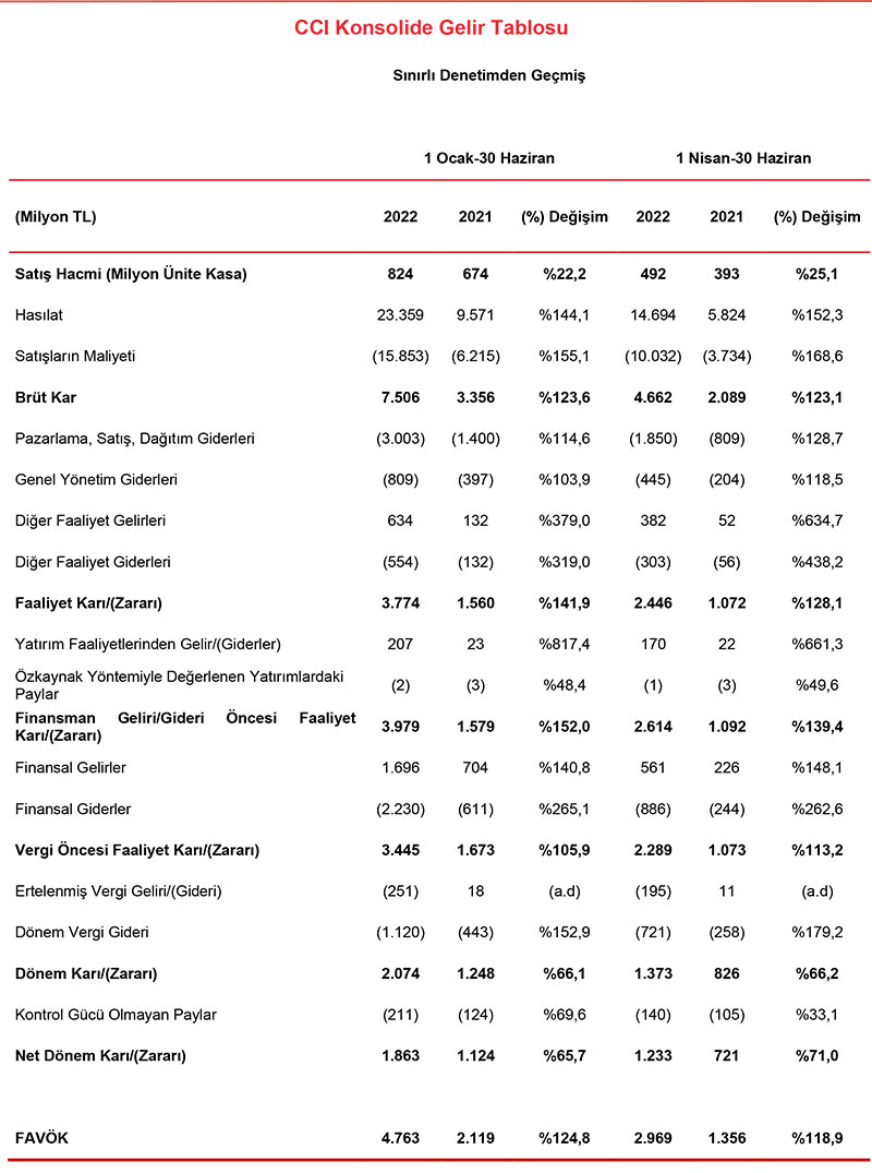 "Coca Cola İçecek", ikinci rübdə güclü satış performansı göstərərək, konsolidə edilmiş satış gəlirlərini 14 milyard 694 milyon TL-yə yüksəldib. Şirkətin satışları rüblük olaraq 152,3 faiz; ilin ilk 6 ayında 144,1 faiz artıb. Beləliklə, 6 aylıq satış gəliri 23 milyard 359 milyon TL-yə çatıb.