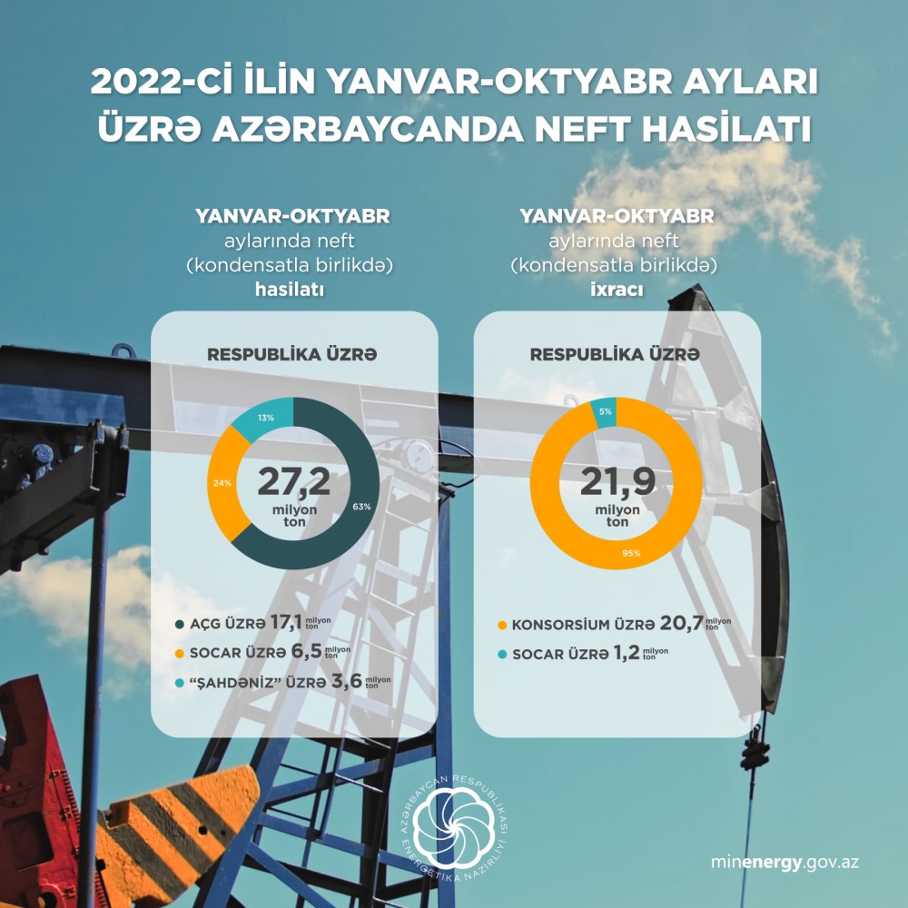 2022-ci ilin yanvar-oktyabr aylarında ölkədə 27,2 milyon ton neft (kondensatla birlikdə) hasil edilib. Respublika üzrə neft hasilatının 17,1 milyon tonu “Azəri-Çıraq-Günəşli”nin, 3,6 milyon tonu (kondensat) “Şahdəniz”in payına düşüb. SOCAR üzrə neft (kondensatla birlikdə) hasilatı 6,5 milyon ton təşkil edib.