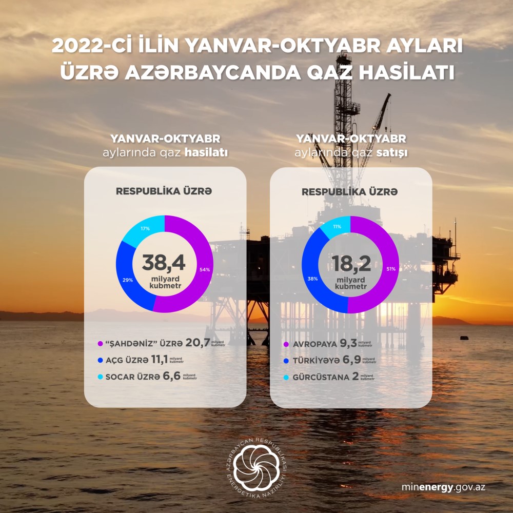 Energetika Nazirliyinin yaydığı operativ məlumatlara görə, 2022-ci ilin yanvar-oktyabr ayları üzrə Azərbaycanda 38,4 milyard kubmetr təbii qaz hasil edilib.