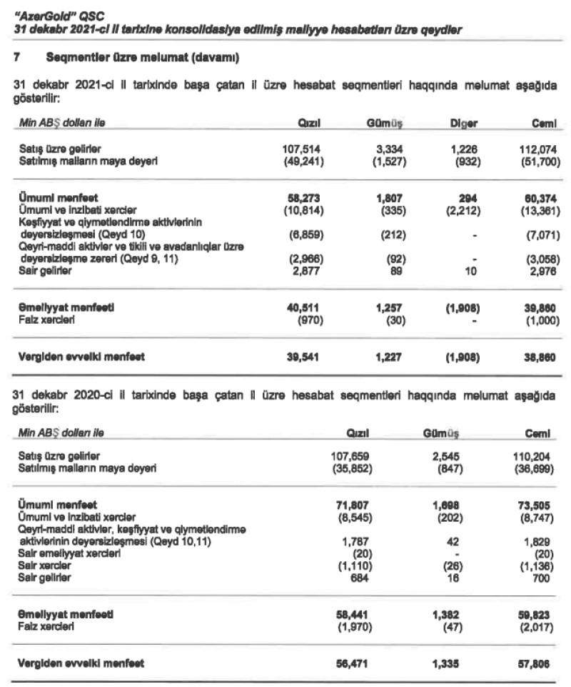 Qeyd edək ki, "AzerGold" 2020-ci il də qızıl satışından 107 milyon 659 min dollar, gümüş satışından 2 milyon 545 min dollar olmaqla cəmi 110 milyon 204 min dollar cəmi gəlir əldə etmişdi.