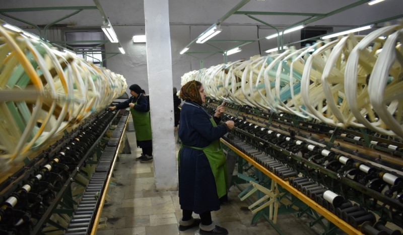 Kümçülərdən tədarük olunan yaş barama müəssisənin xammal şöbəsində çeşidlənib təmizləndikdən sonra baramaaçan istehsalatına göndərilir. Burada istehsal olunan xam ipək daha sonra müəssisənin burucu sexinə daxil olur. Sexin rəisi Rasim Səmədov 1977-ci ildən bu müəssisədə, 1980-ci ildən isə burucu sexində çalışır. Onun sözlərinə görə, sexə daxil olan xam ipək sabunla, yağla, digər vasitələrlə isladılır, yumşaldılır və açılaraq toxucu istehsalatının, xalça sexinin tələbatına uyğun olaraq 3 teldən 100 telədək cütləşdirilib burulur və hazır məhsul şəklində həmin istehsalatlara verilir.