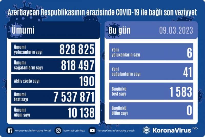 Azərbaycan Respublikasında koronavirus (COVID-19) infeksiyasına 6 yeni yoluxma faktı qeydə alınıb, 41 nəfər müalicə olunaraq sağalıb.