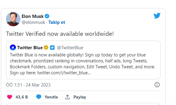 Twitter şirkətinin Baş direktoru Elon Musk (İlon Mask), hesabın təsdiqlənmiş olduğunu bildirən "mavi" nişanın artıq bütün dünyada istifadəsinin mümkün olduğunu açıqlayıb.