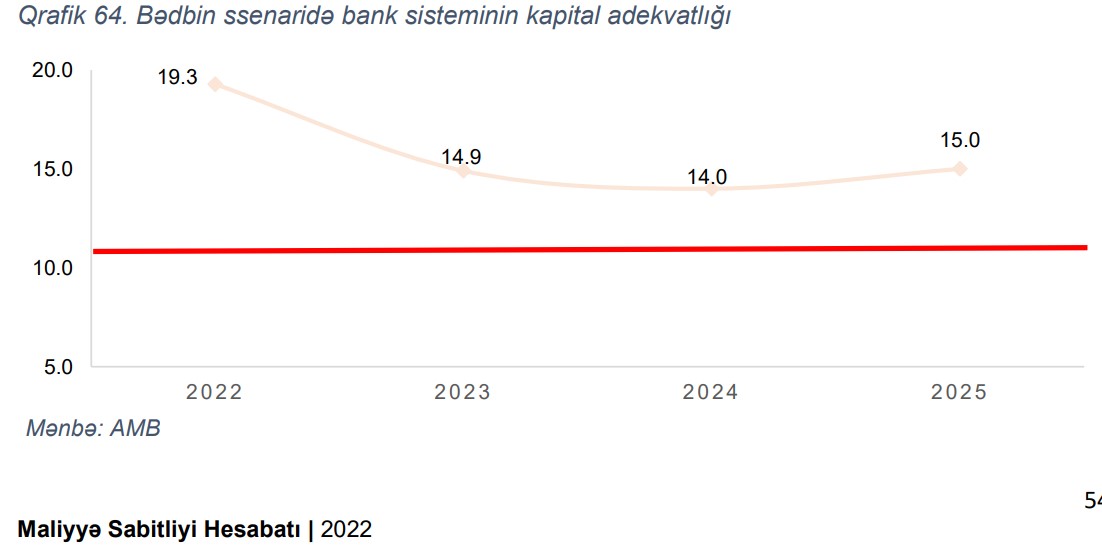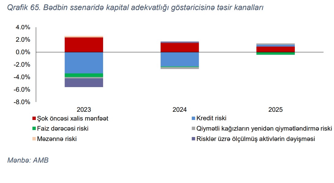 Hesabatda bildirilir ki, stress test nəticələri bank sektorunun mövcud kapital buferinin potensial itkiləri absorbsiya etmək ("udmaq") potensialında olduğunu göstərir. Bədbin ssenaridə bank sektorunun kapital adekvatlıq əmsalı 2023-cü ildə 4.4 faiz bəndi azalaraq 14.9%, 2024-cü ildə isə 14% təşkil edir. Bununla belə, 2025-ci ildə gəlirliliyin bərpası fonunda kapital adekvatlığı əmsalı 15%-ə qalxır.
