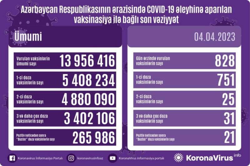 Nazirlər Kabineti yanında Operativ Qərargahdan verilən məlumata görə, bir gündə birinci mərhələ üzrə vaksinasiya olunanların sayı 751, ikinci mərhələ üzrə vaksinasiya olunanların sayı 25, üç və daha çox doza üzrə vaksinasiya olunanların sayı 31, pozitiv nəticədən sonra buster doza üzrə vaksinasiya olunanların sayı 21 nəfərdir.