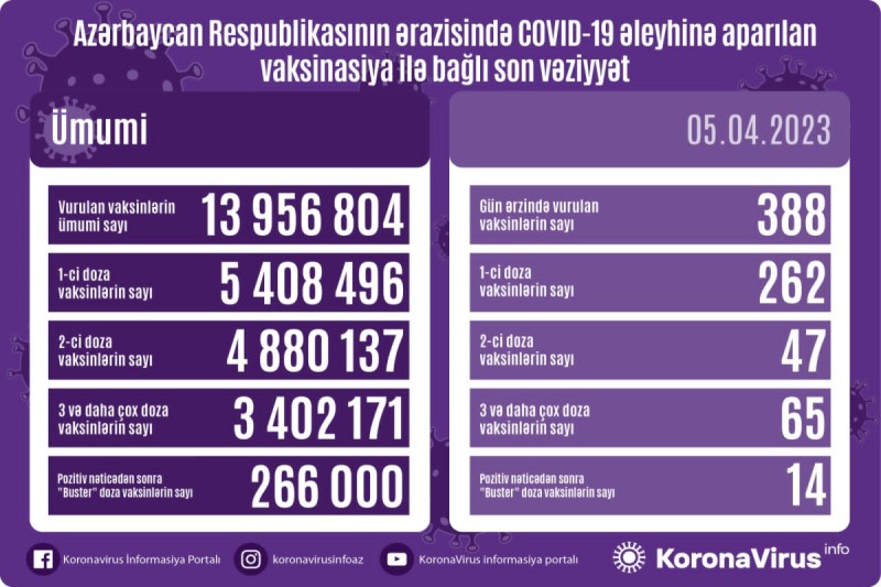 Azərbaycanda son sutkada koronavirus (COVID-19) əleyhinə 388 vaksin vurulub. Bir gündə birinci mərhələ üzrə vaksinasiya olunanların sayı 262, ikinci mərhələ üzrə vaksinasiya olunanların sayı 47, üç və daha çox doza üzrə vaksinasiya olunanların sayı 65, pozitiv nəticədən sonra buster doza üzrə vaksinasiya olunanların sayı 14 nəfərdir.