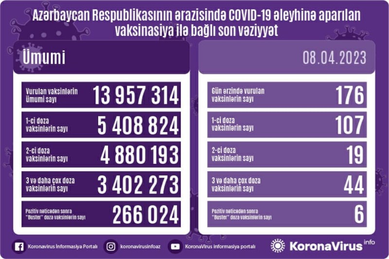Azərbaycanda son sutkada koronavirus (COVID-19) əleyhinə 176 vaksin vurulub. Bir gündə birinci mərhələ üzrə vaksinasiya olunanların sayı 107, ikinci mərhələ üzrə vaksinasiya olunanların sayı 19, üç və daha çox doza üzrə vaksinasiya olunanların sayı 44, pozitiv nəticədən sonra buster doza üzrə vaksinasiya olunanların sayı 6 nəfərdir.