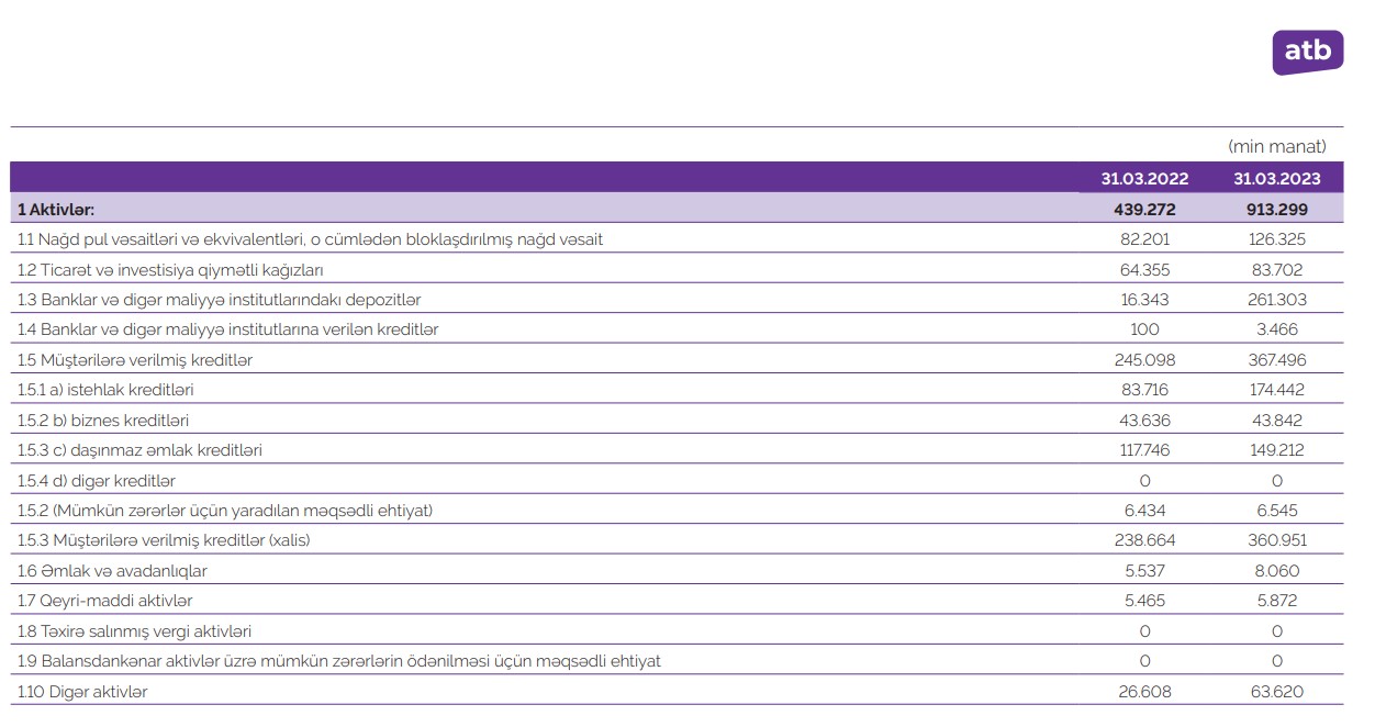 31.03.2023-cü il tarixində "Azər-Türk Bank" 913 milyon 299 min manat cəmi aktivlərə, o cümlədən 367 milyon 496 min manat cəmi kredit portfelinə malik olub. Ötən ilin eyni tarixində Bank 439 milyon 272 min manat cəmi aktivlərə, o cümlədən 245 milyon 98 min manat kredit portfelinə malik idi. Beləliklə, son 1 ildə "Azər-Türk Bank"ın cəmi aktivləri 2,1 dəfə, kredit portfeli 50% artıb.